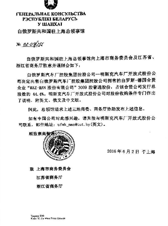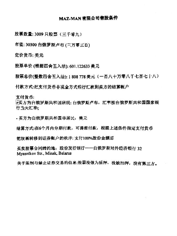 白俄罗斯汽车厂控股公司-明斯克汽车厂出售股权
