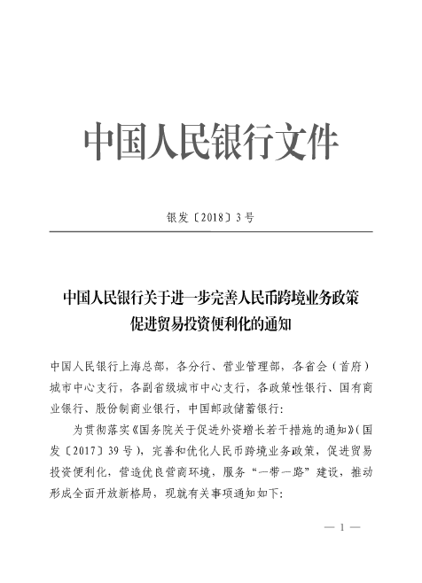 中国人民银行关于进一步完善人民币跨境业务政策促进贸易投资便利化的通知
