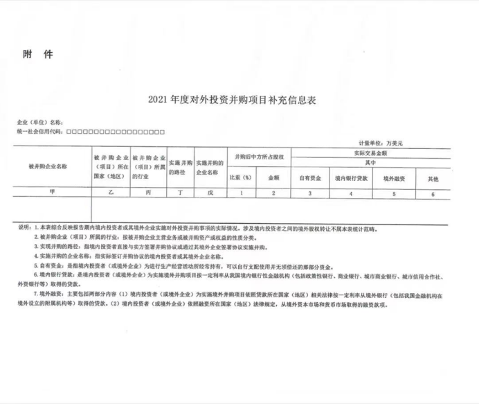 各省、自治区、直辖市及计划单列市、新疆生产建设兵团商务主管部门,有关企业: 为做好2021年全国对外直接投资统计年报等工作,准确、完整反映我国境内投资者对外直接投资情况,更好服务构建新发展格局,现将有关工作通知如下: 一、关于2021年度对外直接投资统计年报填报工作 (一)请各单位根据《商务部国家统计局国家外汇管理局关于印发(对外直接投资统计制度)的通知》(商合函(2022]16号)的要求,做好辖区或下属企业2021年度对外直接投资统计年报的组织填报、数据审核工作。中央企业及其下属子公司请及时更新登录系统的电子钥匙。 (二)中央企业和单位请于2022年6月30日前完成2021年度对外直接投资统计年报的网上填报工作(https://ecompmofcomgov.cn),并于8月25日前将年度统计分析报告报送商务部。各省级商务主管部门请于2022年7月10日前完成 辖区企业年报的组织填报和网上审核工作,并于8月31日前将年度统计分析报告报送商务部。 (三)为配合对外投资台账工作的开展,请各单位认真梳理对外投资活动,准确填报“返程投资情况”(FDIN5表)“境内投资者通过境外企业再投资情况(FDIN6表)和“境外主要矿产资源情况”(FDIN7表)。 (四)为做好境外电力领域投资和重点农产品产出情况专项统计调查,请各单位及时督促有关企业填报新调整的“境外电力生产领域投资情况”(FDIN8表)和新增的“境外重点农产品产出情况”(FDIN9表)。 (五)根据统计制度规定,为实施对外承包工程项目而设立的1年(含)以上的办公室(包括分公司、经理部、项目部等)属于对外直接投资统计范围,请有对外承包工程业务的企业据实填报。 (六)为完整、准确反映年度对外投资并购情况,请各单位认真梳理辖区或下属企业2021年度实际完成的对外投资并购项目,并于7月10日前将“2021年度对外投资并购项目补充信息表”(见附件)通过电子邮件或传真方式报送至商务部(已在商务部业务系统统一平台报送过2021年并购月报的项目无需再次报送)。 二、关于2022年对外直接投资统计布置和培训工作 (一)按时督促填报新增月报报表。请各单位按照新版《对外直接投资统计制度》(商合函(2022]16号)要求,及时指导辖区或下属企业按时填报新增的“境外企业在外人员月度变动情况”(FDIY7表),并在对外直接投资统计系统的境外企业管理中选择是否为境外节能环保产业企业,以自动生成“境外节能环保产业月度投资情况”(FDIY8表)。 (二)开展统计学习和培训。请各单位按照新版统计制度要求,结合本地区疫情防控政策有序开展统计工作布置和培训,对制度修订内容进行重点解读,对工作中存在的问题进行认真剖析,不断提升统计数据质量和统计人员工作水平。可登录商务部“走出去”公共服务平台(http://fec.mofcomgovcn)-统计数据档目,点击“数据填报指南”,下载学习相关培训视频和常见问题答疑。 (三)及时全面布置工作。请各单位接本通知后,尽快落实相关工作布置,确保对外直接投资统计年报和月报按时、保质完成。2021年统计工作中发现,部分单位忽视了统计年报工作布置或仅以转发文件方式代替布置,导致境外企业再投资、返程投资、矿产资源等年报漏报现象较为严重,数据质量较差,返工率较高等问题。 各单位要提高政治站位,高度重视对外直接投资统计工作,切实落实统计主体责任,严格防范惩治统计造假弄虚作假,坚持统计部署和培训工作不放松,为统计工作的高效开展提供必要的经费保障,保证统计人员相对稳定,持续提升统计数据质量,不断强化统计工作对推动对外投资合作高质量发展、服务构建新发展格局的支撑和保障作用。 如有问题,请及时与商务部联系。 联系人:合作司张哲杨法皓 电话:(010)85093435 65197179 传真:(010)65197932 电子邮箱:hzstongji@mofcom.gov.cn 附件:2021年度对外投资并购项目补充信息表