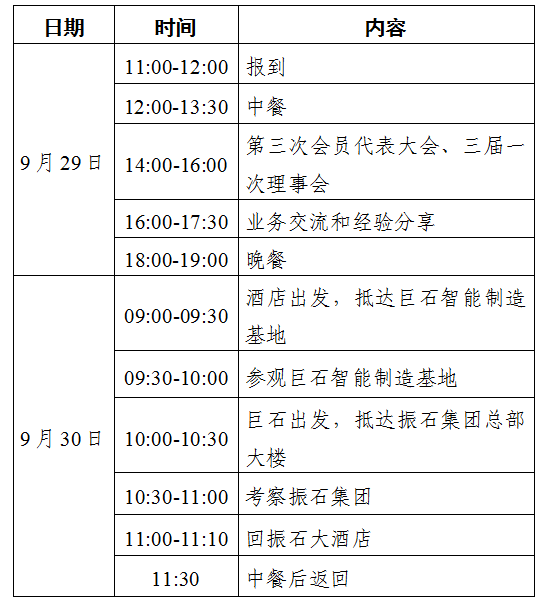 各有关单位: 在浙江省商务厅、浙江省民政厅的正确指导和理事会的大力支持下,浙江省境外投资企业协会经过八年的不懈努力,取得了一定的成绩。根据协会章程规定,我会第二届理事会已届满。为总结经验,顺利完成换届工作,根据协会二届四次理事会会议精神,我会拟于近日召开浙江省境外投资企业协会第三次会员代表大会和三届一次理事会。现将有关事项通知如下: 一、会议时间及地点 时间:2022年9月29日-30日 地点:振石大酒店(地址:嘉兴市桐乡市振兴东路199号,电话:0573-88188888) 二、参会人员 省商务厅领导;省商务厅外经处、法规处相关负责人;省民政厅相关负责人;省境外投资企业协会会员单位代表;省境外投资企业协会秘书处工作人员。 三、会议议程