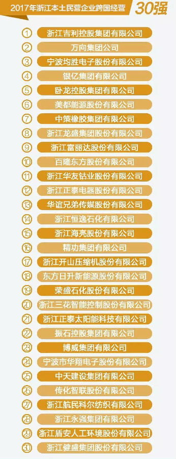 浙江本土民营企业跨国经营强企首次出炉2018-01-212017年年初,浙江省政府办公厅印发《加快培育浙江本土民营跨国公司三年行动计划(2017-2019年)》(浙政办发〔2017〕8号)。在浙江省商务厅指导和支持下,浙江省境外投资企业协会对浙江企业跨国经营绩效评估监测平台上的95家、总部设在浙江的民营企业(非金融类企业)的海外资产、海外营业收入、海外员... -