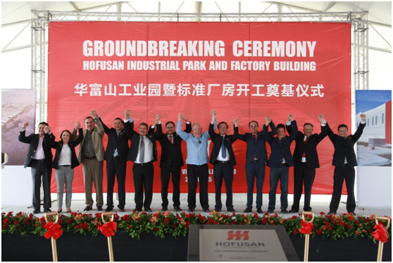 墨西哥当地时间2017年8月25日,北美华富山工业园暨标准厂房开工奠基仪式在墨西哥新莱昂州蒙特雷市隆重举行。中墨两国地方政府代表、华富山股东和270多名政企代表出席仪式、共同见证。