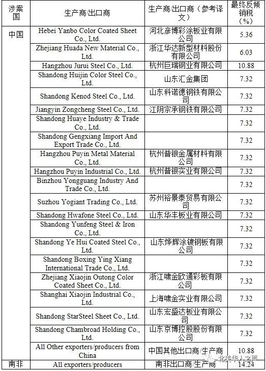 6月13日,巴基斯坦国家关税委员会发布第ADC51号公告,对原产于或进口自中国和南非的彩色涂层钢卷/板(ColorCoatedSteelCoils/Sheets)作出反倾销肯定性终裁:涉案产品的进口对巴基斯坦构成倾销并对巴基斯坦国内产业造成了实质性损害或实质性损害威胁,故决定自即日起对涉案产品基于成本加运费价格(C&FValue)征收反倾税,有效期为5年。