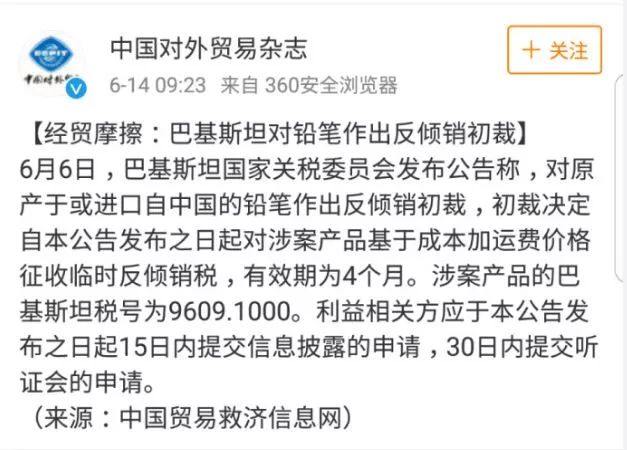 另,巴基斯坦对中国铅笔作出反倾销初裁。
