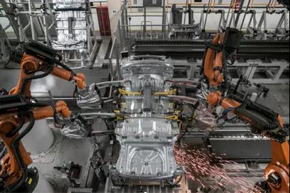 其中激光焊接是技术亮点之一,主焊环节配备了4台激光测量机器人,能自动识别车型,并按照相应标准进行对比测量。其中主拼工位一期配备了8台机器人进行定位焊接,目前能实现2款车型的切换,未来最大可实现6款车型同时生产,生产效率有了可靠保证。
