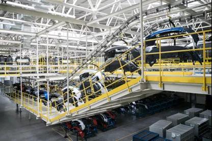 总装车间占地面积约59000平方米,由一条总装主线和多条分装线组成,每小时可生产30台车,也就是每两分钟就有一台新车下线。