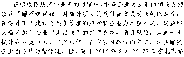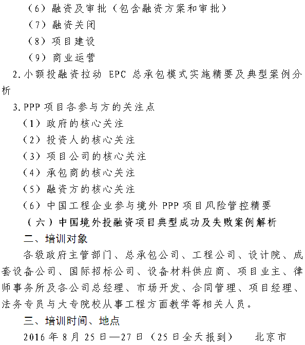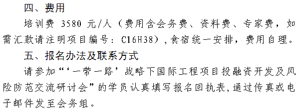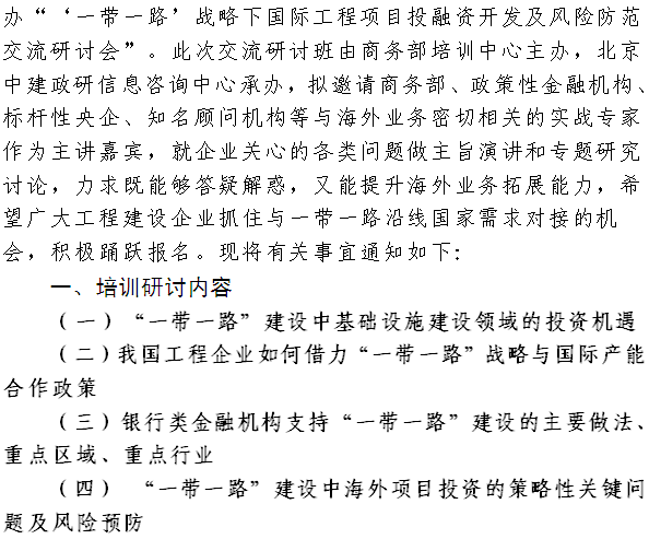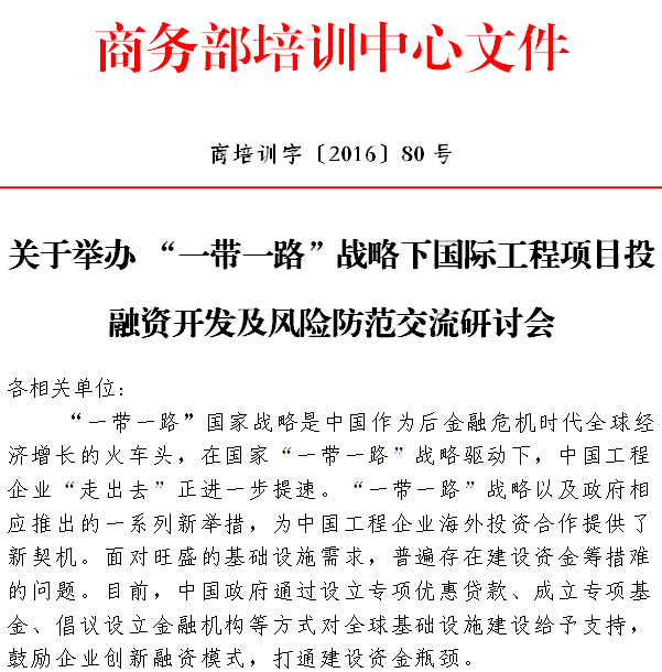 商务部培训中心关于举办“一带一路”战略下国际工程项目投融资开发及风险防范交流研讨会