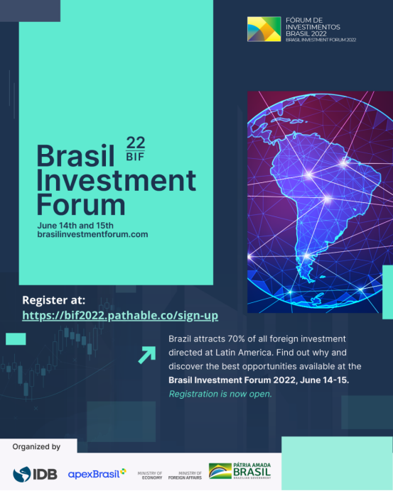 第五届巴西投资论坛(BIF)将于2022 年 6 月 14 日至 15 日在线举行。巴西投资论坛是拉丁美洲最大的外国投资活动。