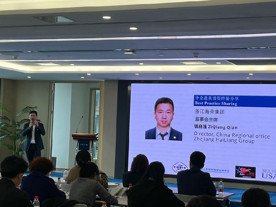 美国驻沪总领事馆何乐进总领事致欢迎词,王勇安参赞介绍选择美国项目,普华永道、华美银行等机构专业人士进行了赴美投资政策讲解、环境分析,美国印第安纳州、佐治亚州、马里兰州、纽约州经济发展机构代表介绍各州投资环境。我会会长单位浙江海亮股份有限公司作为企业嘉宾作了海亮股份在美投资项目情况介绍以及赴美投资经验分享。海亮股份自2014年在美国设立销售办公室,到2016年收购美国企业JMF,拥有稳定的客户群以及成熟的销售渠道。再到2018年开始布局美国工厂,加强了海亮在全球范围的供给能力。