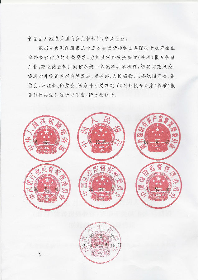 2018年1月25日,商务部、人民银行、国资委、银监会、证监会、保监会、外汇局共同发布了《对外投资备案(核准)报告暂行办法》(商合发[2018]24号,以下简称《办法》),以下为《办法》全文。